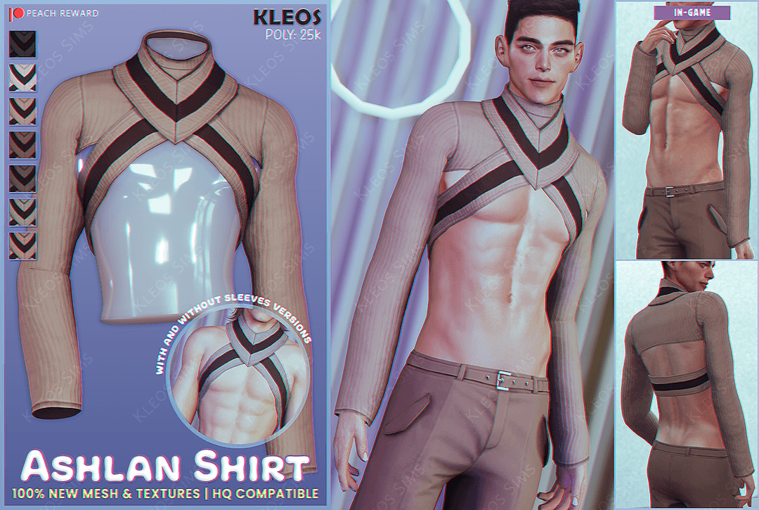Ashlan Shirt Per suggestion, a funky cropped top inspired by chat. Matching pants to come soon! 🩵Made specifically for TS4 🩵Compatible with Sejian’s Custom CAS tag mod 🩵Compatible with thepancake’s Colour Slider mod 🩵2 versions included MESH: all LODs, 100% new, poly 25k TEXTURES: 100% new, HQ enabled, norms incl., merged shadow maps for custom skin bug