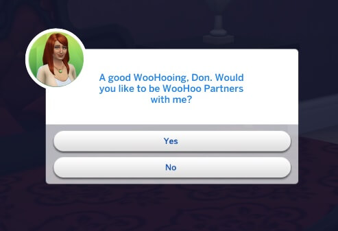 Ask to be WooHoo Partners Situations Ask to be WooHoo Partners interaction is set to non-autonomous by EA, you will never see it in the game. So, a sudden idea. Description: Your Sim may be asked by their partner Sim if they want to be woohoo partners after a breakup/divorce/woohoo.