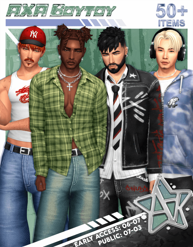 Ever since the beginning of AxA packs, male clothing was only ever in the large collections. Recently Ayoshi and I decided that we should make an male focused AxA mini, which soon turned into a much larger collection. AxA Boytoy is focused entirely on male Sims, with the occasion item female compatible item. Featuring hairs, tops, bottoms, hats, headphones, a pair of sneakers, jewelry, and even a tote bag with a labubu. These items and their variations total up to 50+ new CAS assets for your male sims to expand their closets with. Grungy, fruity👀, or a little bit of both, AxA Boytoy is made for the boy who knows they’re a toy. 🧸