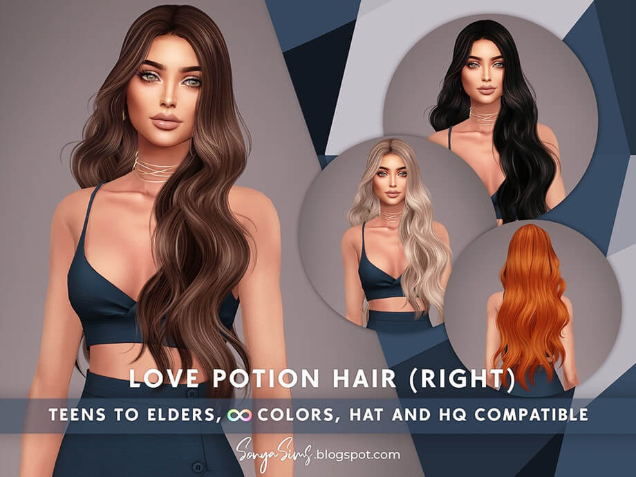 Love Potion Right- Longe wavy hair with curls. One Side. – All LODs (essential for gameplay performance). – Kids to elders. – HQ and hat compatible. – Almost unlimited colors.