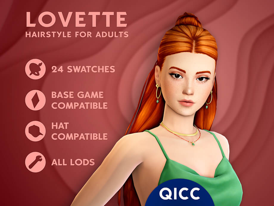 Lovette Hair A long wavy hairstyle with a high bun. – Maxis Match – Base game compatible – Hat compatible – Adult CC for the Sims 4 – 24 EA swatches