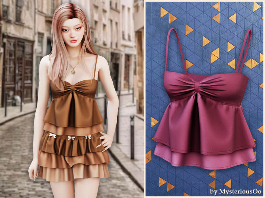 A feminine camisole top featuring delicate straps and a ruched bust accent. The layered peplum hem creates soft movement and a flattering silhouette. Perfect for pairing with skirts or shorts for romantic, summer-inspired outfits.