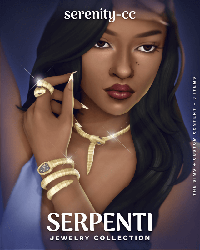 The Serpenti Jewelry Collection (3 items) by Serenity-cc Today I’m bringing another jewelry classsssic šŸ . The Serpenti Collection is perfect for adding a touch of elegance and sensuality to any look. šŸ’‹ The collection features 5 new items in total. The watch and rings are available for both the left and right sides and are also compatible with male frames. More details: Teen-Elder. Custom thumbnails Base game compatible.