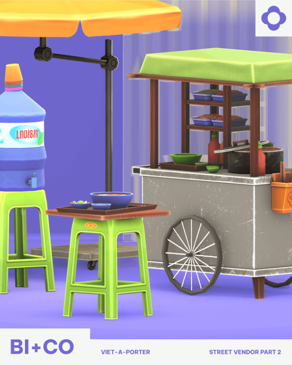 Viet-A-Porter – Street Vendor Part 2 Hey there Simmers! We’re finally back with part 2 of our street vendor collection. This time, we’re excited to introduce you to an everyday scene featuring one of Saigon’s most iconic street foods – Hủ Tiếu. Accompanying this famous dish is the equally iconic Hủ Tiếu cart! But that’s not all – from the trusty plastic stool to the expansive umbrella, we’re striving to recreate the intimate and down-to-earth ambiance of everyday Vietnamese street life with this flavorful set